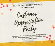 We’re excited to team up with Hometown Meats to bring you a complimentary appetizer buffet. Enjoy a glass of bubbly, live music by Tim Howe, giveaways, and a fun night out with all of you who support us year round! Cheers to YOU!